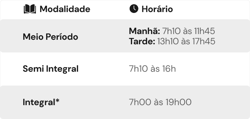 Oferecemos três opções de jornada escolar para atender diferentes rotinas familiares, todas com acompanhamento pedagógico e ambientes seguros e acolhedores: