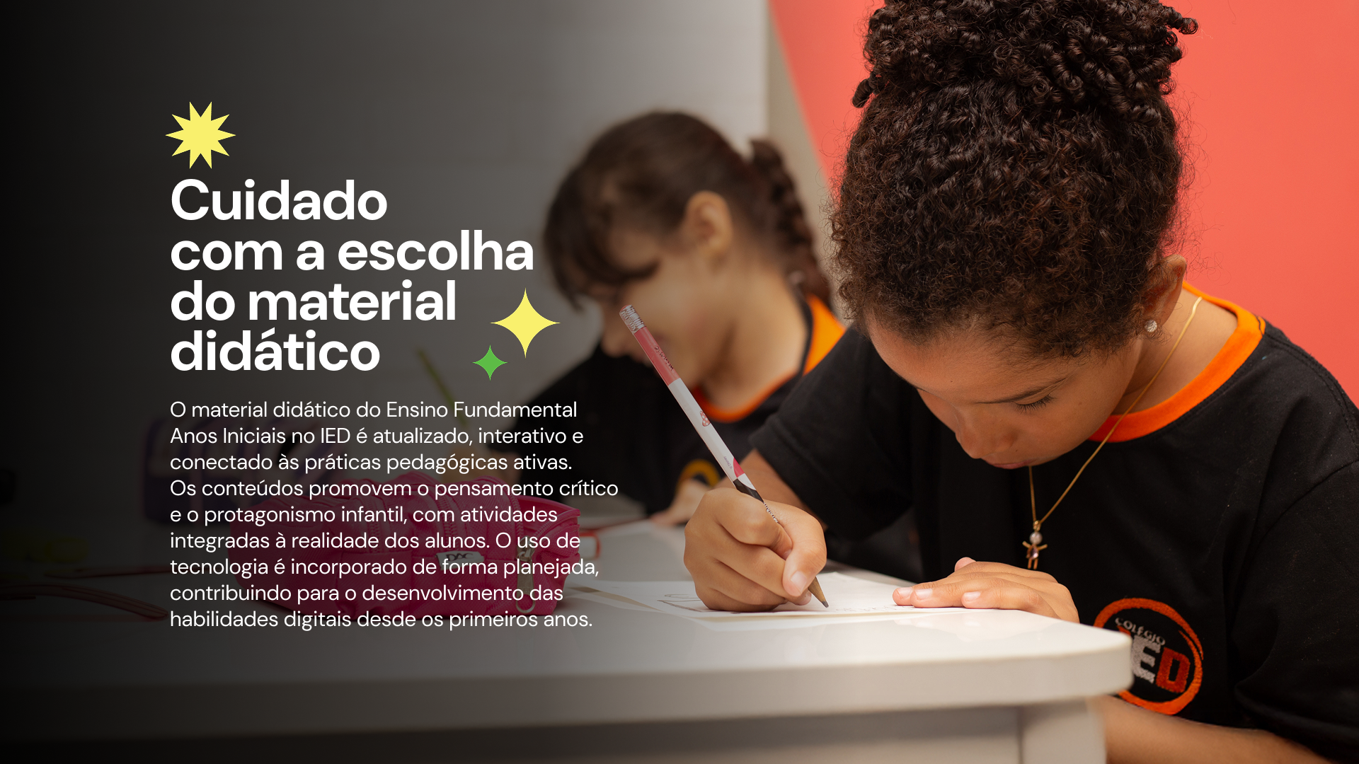 O material didático do Ensino Fundamental Anos Iniciais no IED é atualizado, interativo e conectado às práticas pedagógicas ativas. Os conteúdos promovem o pensamento crítico e o protagonismo infantil, com atividades integradas à realidade dos alunos. O uso de tecnologia é incorporado de forma planejada, contribuindo para o desenvolvimento das habilidades digitais desde os primeiros anos.