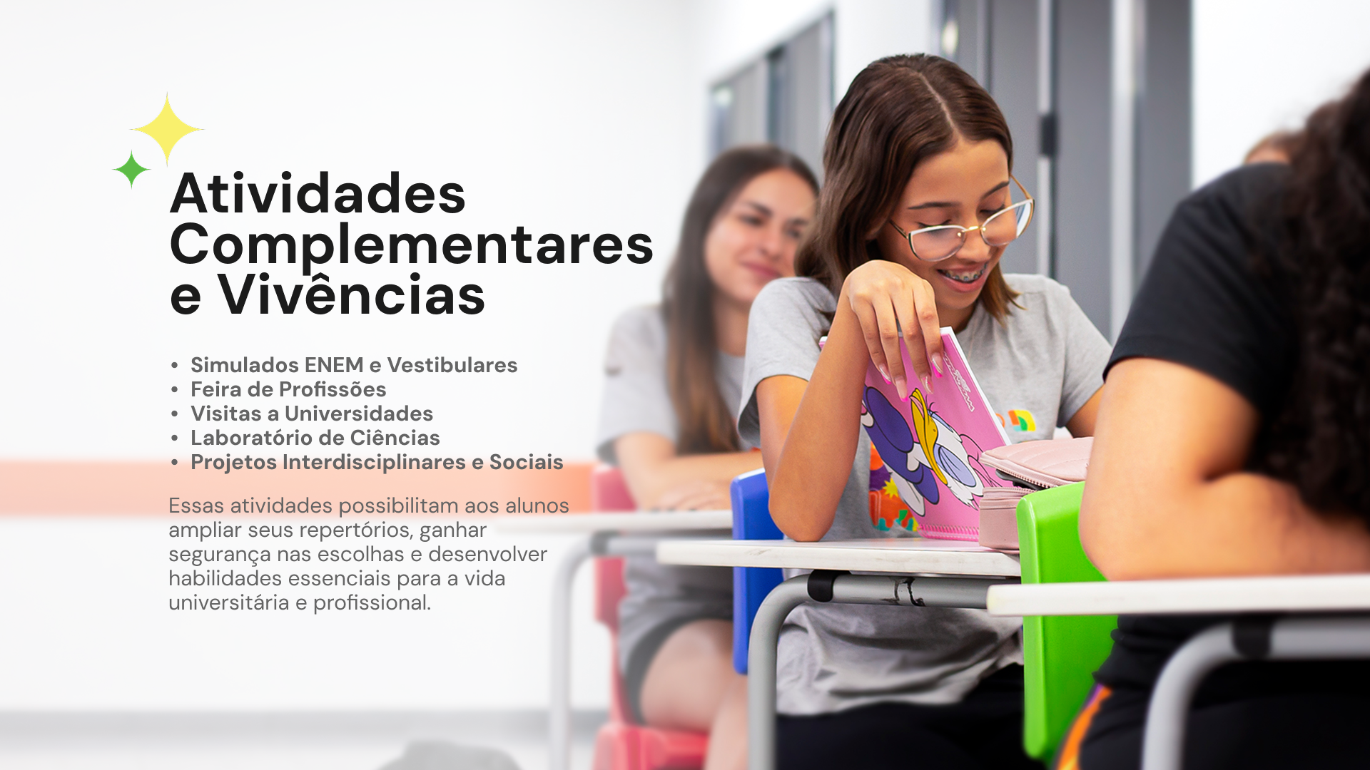 Essas atividades possibilitam aos alunos ampliar seus repertórios, ganhar segurança nas escolhas e desenvolver habilidades essenciais para a vida universitária e profissional.